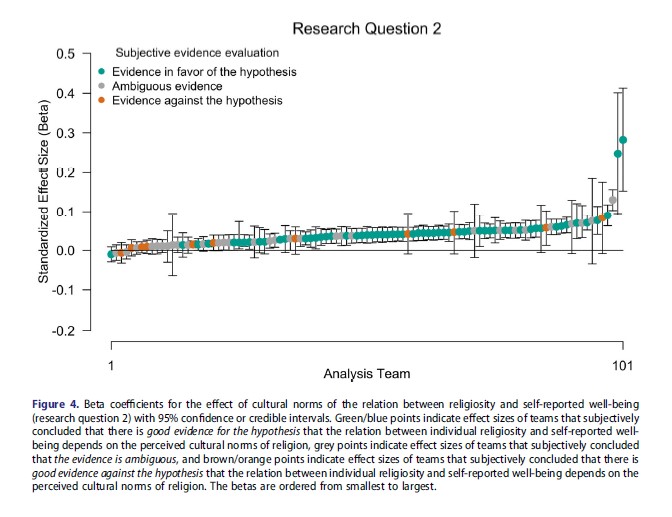 - Research Question 2: Out of the 101 beta values extracted from the 120 teams, 97 of the beta values were positive, and 66 of the positive values had a beta value whose 95% confidence/credible interval excluded zero. This means that many of the results supported the prediction that “the relationship between religiosity and self-reported well-being depends on perceived cultural norms regarding religion.” See the results in Figure 4 adopted from the original article below.