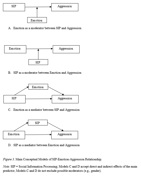 The authors acknowledged the uncertainty of how emotions influenced SIP and how this subsequently affected aggression. They, thus, suggested various models (e.g., moderation and mediation models; see Figure 3 below) and recommended the use of a longitudinal method to examine the models to comprehend the direction of the relationship. As an alternative that is less costly and can test the models proposed by the authors, I would like to recommend the Metanalytic structural equation model (MASEM). This statistical method enables researchers to combine the effects from single studies to test causal (I use the term cautiously as this may be arguable) or structural paths to understand relationships. Moreover, this method allows the researchers to incorporate studies that investigated bi-relational relationships and not necessarily include studies that investigated all three variables simultaneously. For instance, the current review excluded studies that investigated only the relationship between emotion and aggression (n = 9), between SIP and emotion (n = 10), and between SIP and aggression (n = 155).