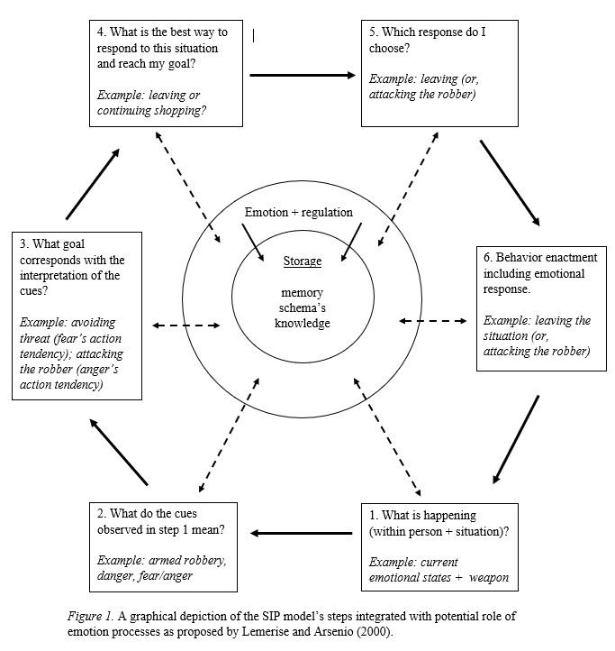 I will review the article by Smeijers et al. (2020) on The Association Between Emotion, Social Information Processing, and Aggressive Behavior. Social information processing (SIP) is a cognitive model that explains how individuals think and act in interpersonal situations. It involves six steps that range from identifying cues to choosing an optimal response. According to this theory, aggression results from a problem in any of the six steps (Crick & Dodge, 1994). For example, if one interprets another person’s actions as hostile, one may react aggressively. However, this does not account for the role of emotion in influencing aggression. Other researchers have suggested that emotions are important in explaining aggression and may affect SIP (Lemerise & Arsenio, 2000). They proposed a comprehensive model of aggression that integrates emotions and cognition (see Figure 1 below). The purpose of the current article was to examine the empirical evidence for this comprehensive model (Smeijers et al., 2020).