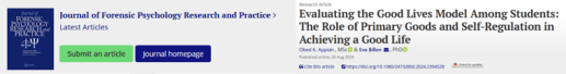 Appiah, O. K., & Billen, E. (2024). Evaluating the Good Lives Model Among Students: The Role of Primary Goods and Self-Regulation in Achieving a Good Life. Journal of Forensic Psychology Research and Practice. https://doi.org/10.1080/24732850.2024.2394528
