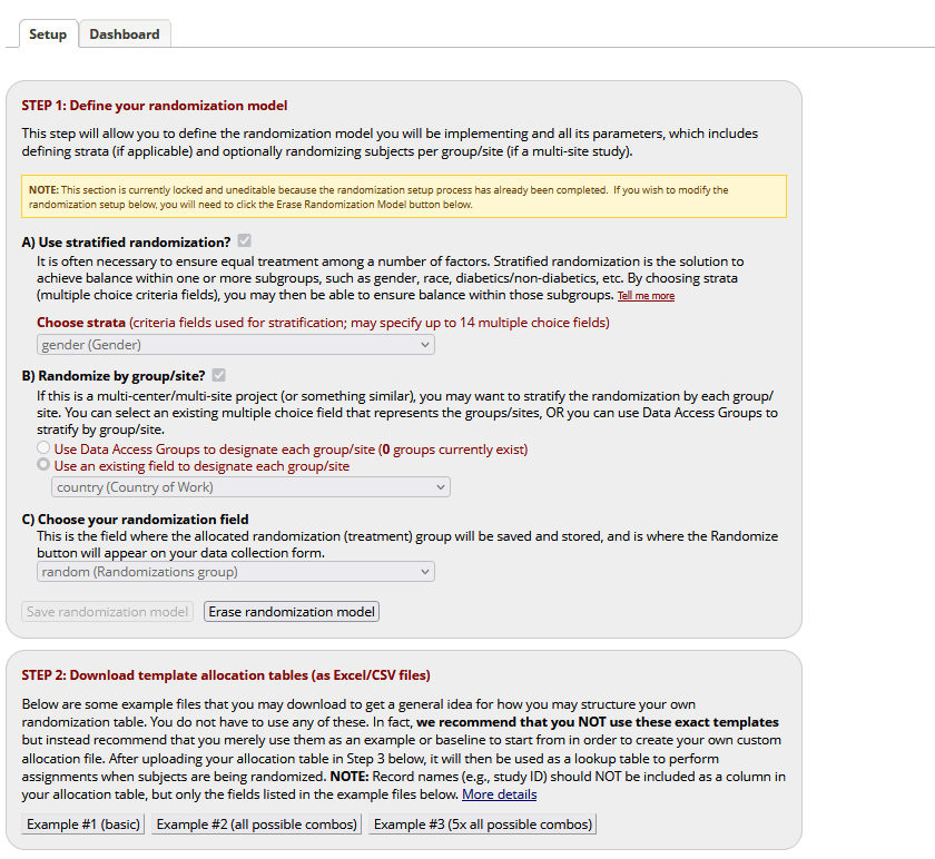 After that, you navigate to the Project Setup page on the top bar menu and click the “Set up a randomization” as seen in label 3 in Figure 4 above (Check Step Three). Here, you have to read the instruction and understand before proceeding. In this case, as seen in Figure 8, under “STEP 1”, I instruct REDCap how I want it to randomise participants into the conditions.