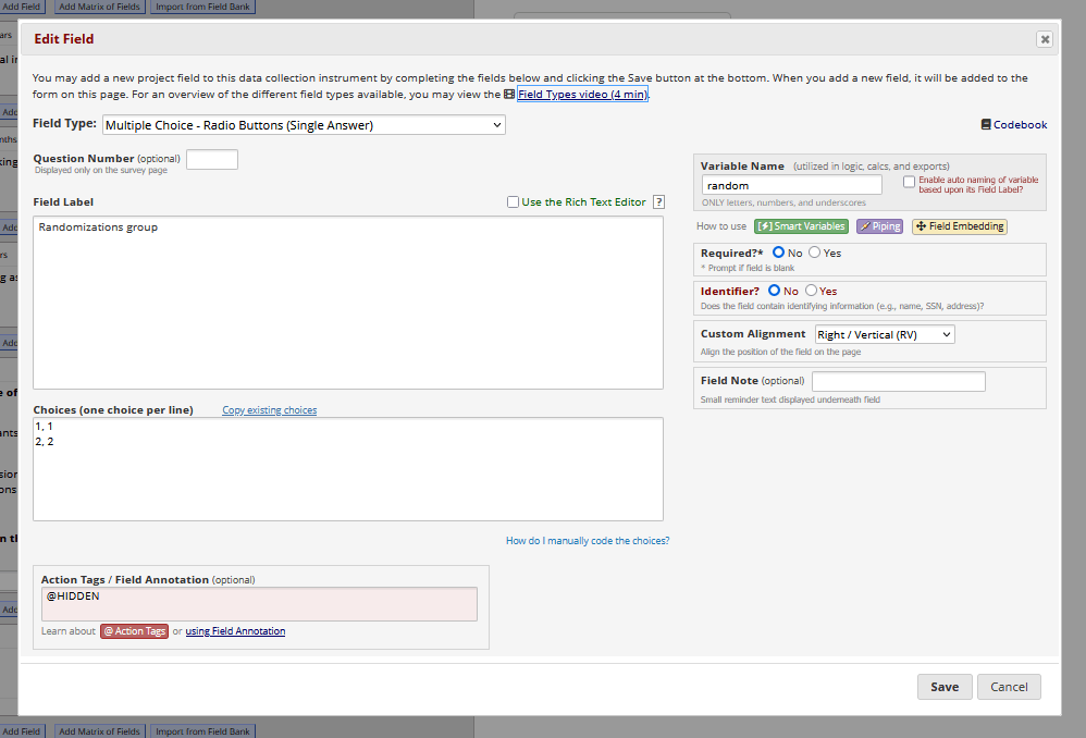 Choose an instrument where you want to set up the randomisation field. In my example, I will set up my randomisation field in the demographic data instrument. When you click the “Demographic Data” add a field to see the image in Figure 2, and in the edit field select the “Multiple choice – Radio Buttons (Single Answer)” field type. Name the field label and the Variable Name. Enter the number of conditions you want in the “Choices” section. In this case I have only two conditions, 1 and 2. In the action tag field select the “@HIDDEN” action tag and save. The action tag ensures that participants do not see this field. After that, you will see the field appearing like Figure 3.