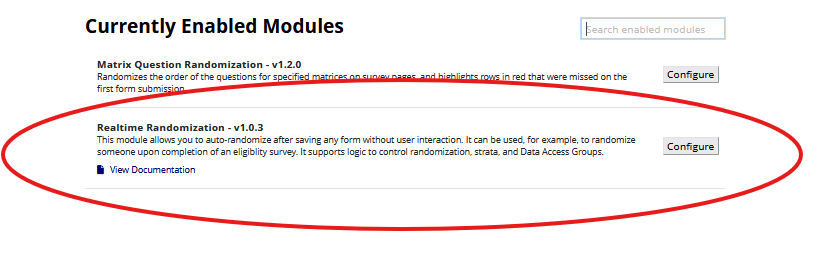 Now we have to install an external module called “Realtime Randomization – v1.0.3”. Inform your administrator to install this for you. This module ensures that your randomization is automatically activated without your influence. First, find the external module panel in the left panel, as seen in Figure 5. When you click on the manage button, you will see the list of external modules that have been installed. In this case, the module has been installed as seen in Figure 6. Click the configure button.