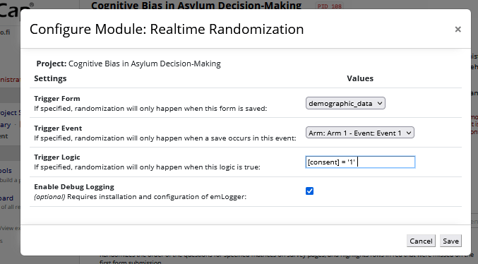 As seen in Figure 7, under the “Trigger form”, select the instrument where you set up the randomization field in Step Two above. In this case, I select the demographic data. With the “Trigger event” select “Arm: Arm 1 – Event: Event 1”. This section is more relevant when you are setting up a longitudinal study. In the case of cross-sectional design, you don’t need to worry about it. After that, you must set up the “Trigger logic”, this ensures that the randomization is done only after the condition is met. In this case, I have instructed that randomization is done only after the participants give consent. After completing the changes above, click “save” in the lower right corner.