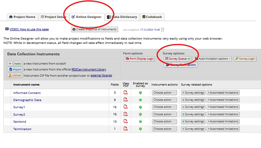 Return to the “Online Designer” and click the “Survey Queue” as seen in Figure 10. This is used for controlling how survey instruments appear to participants. This uses a combination of logics to display how the survey instruments appear to participants. Take note that this may interfere with other survey settings.