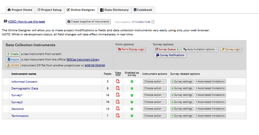As seen in Figure 11 below, I have not activated the informed consent instrument because that is the link I will send to the participant. Under the demographic data instrument, I activate it and I tick the check box for “When the following survey is completed:” and specify that participants should complete the “informed consent” instrument before they can see this instrument. This is a drop-down menu so you can select what you want, but make sure the instrument for the condition of the logic comes before the current instrument. I further add another condition by selecting “AND” indicating that both conditions must be fulfilled and under the “When the following logic becomes true:” I tick the check box and specify that participants have to consent first. The “Auto start” check box ensures that the survey instruments appear to the participants automatically without them selecting it.